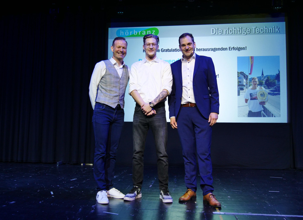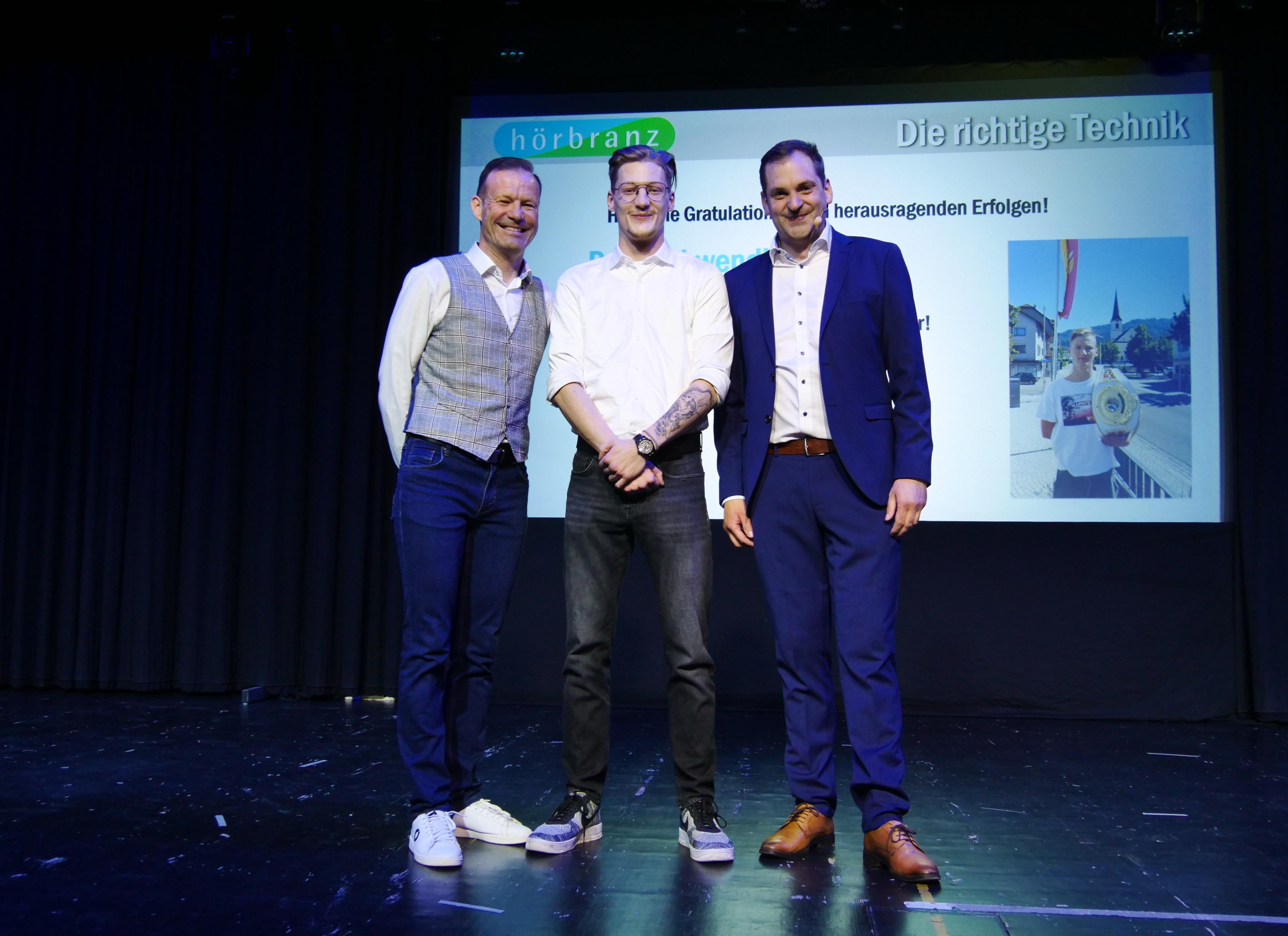 Mehrfacher Amateur-Kickbox-Weltmeister: Paul Schwendinger mit Gemeinderat Gerhard Achberger und Bürgermeister Andreas Kresser.