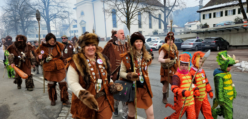 Im neua Häs marschierten die „Berger Steinzeitmenschen der 1. Generation“ mit ihrem Faschingsbürgermeister Roman Rist zusammen mit den kleinen Dinos zur traditionellen Bürgermeister-Absetzung auf dem Platz vor dem GemeindeHaus und in der Festhalle.