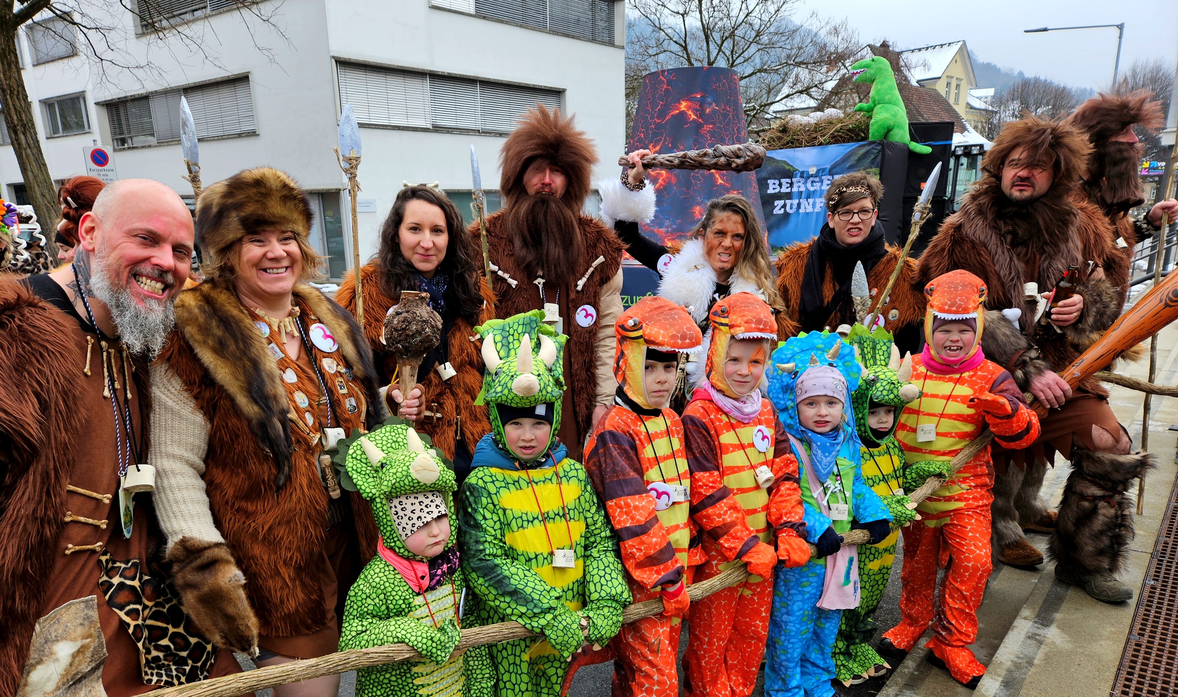 Die „Berger Steinzeitmenschen der 1. Generation“ mit ihrem Faschingsbürgermeister Roman Rist haben im „neua Häs“ mit neuem Song, mit Keulen und Speeren die Gemeinde Lochau übernommen.
