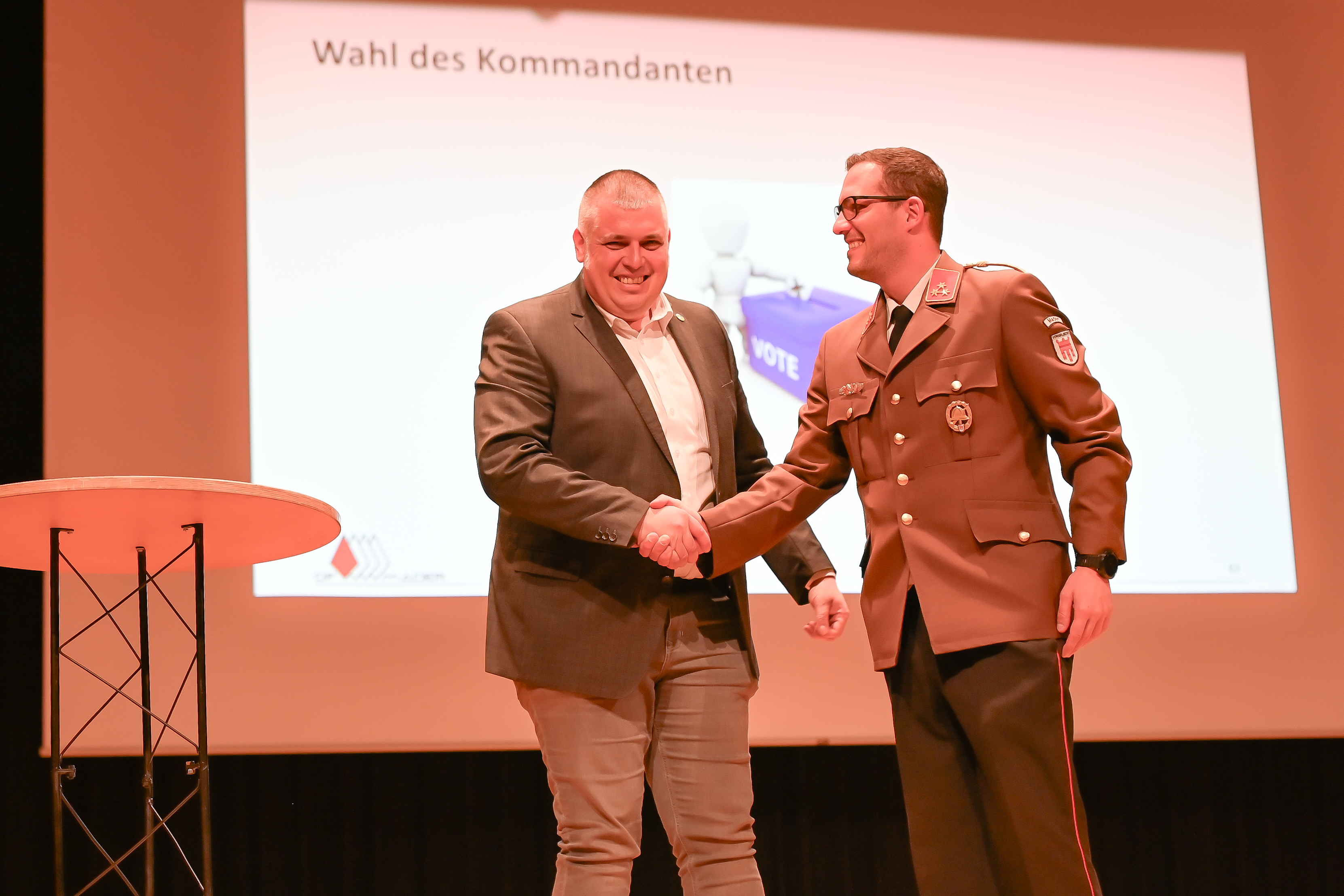 Bürgermeister Daniel Schuster gratuliert Kommandant Alexander Hämmerle zur Wiederwahl.