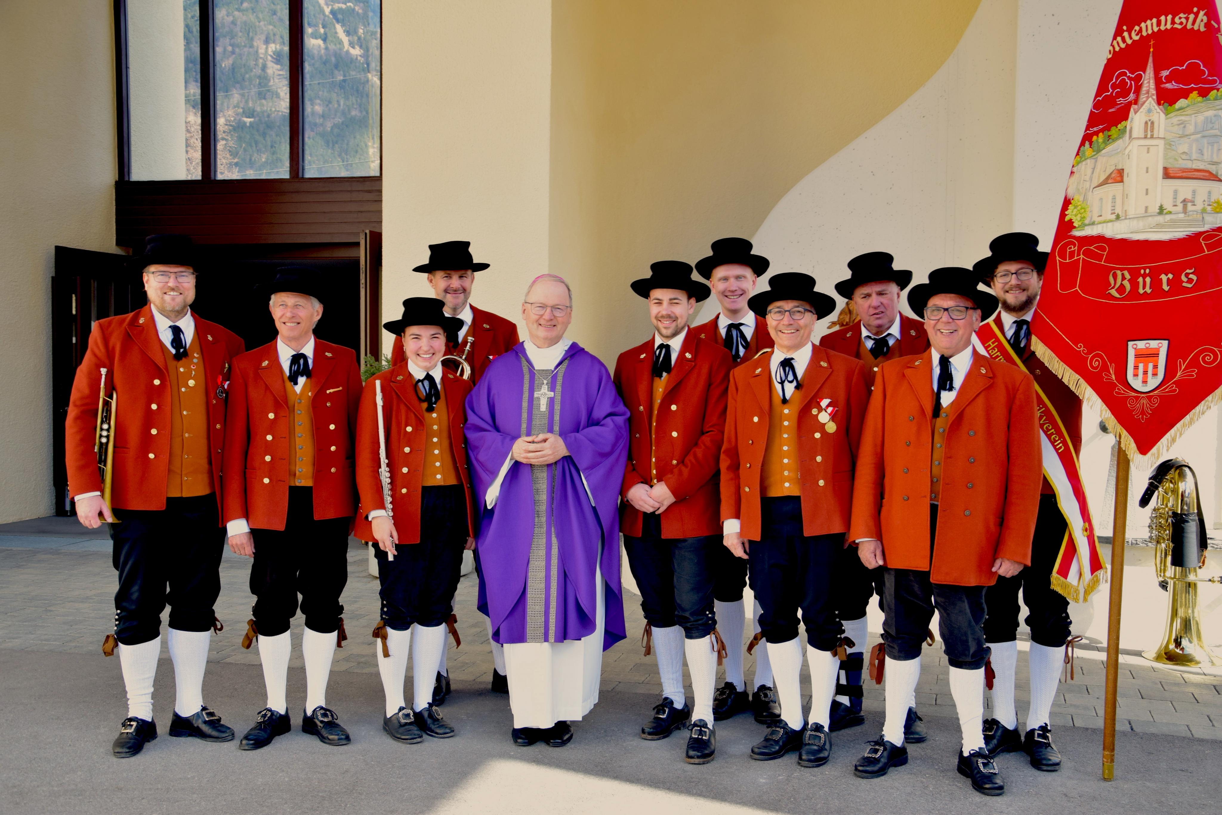 Mitglieder der Harmoniemusik Bürs, Bischof Benno Elbs.