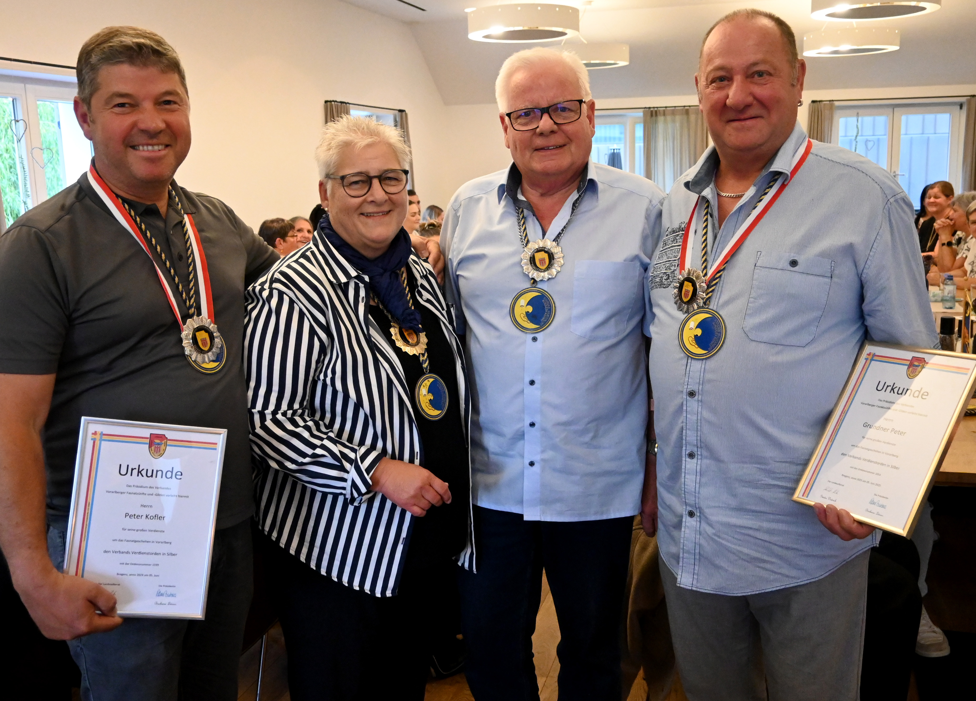 Die ausgezeichneten Mufängar Peter Kofler (l.i.B.) und Peter Grundner (r.i.B.) mit ihrer Obfrau Irmi Heinzle und Vizeobmann Alexandeer Knauth.