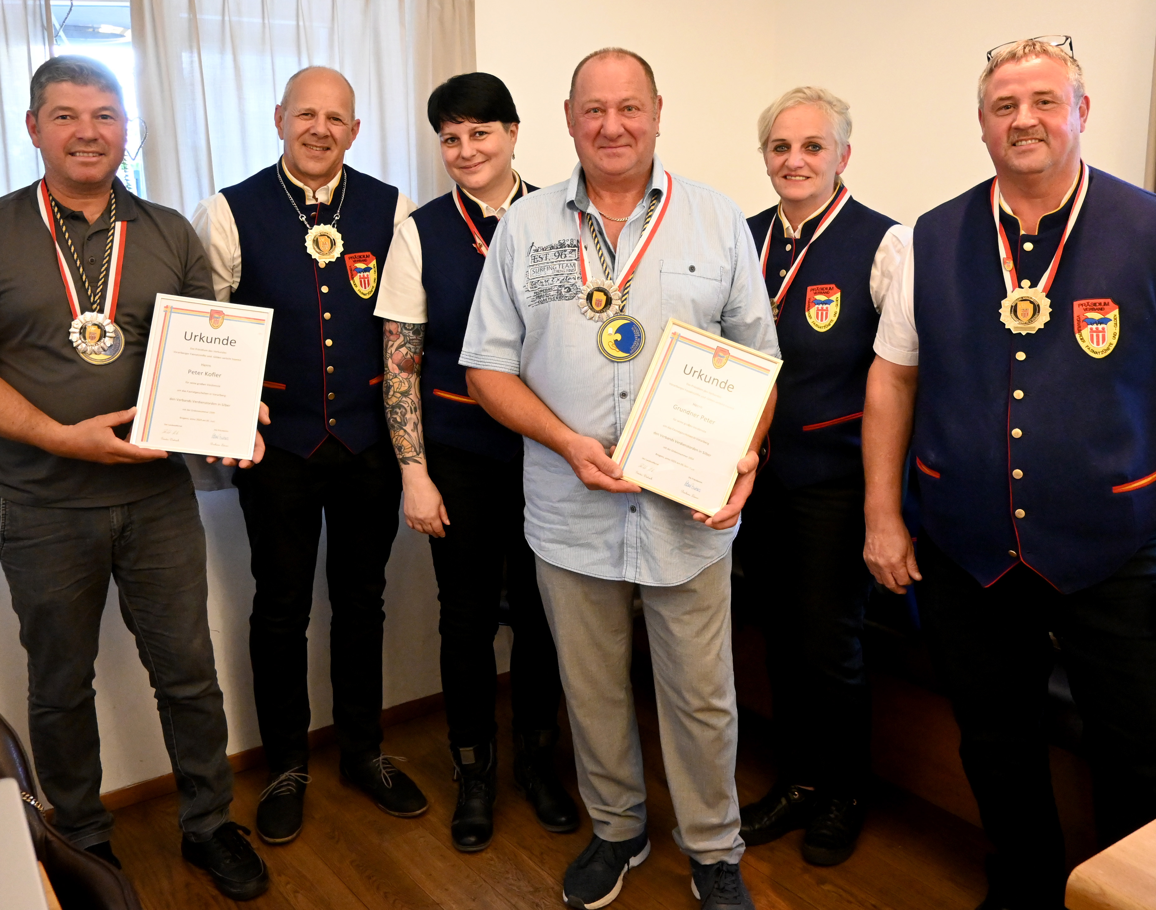 Im Rahmen der VVF-Auszeichnungen/Verdienstorden in Silber (v.l.): die Mufängar 11er-Rat-Mitglieder Peter Kofler und Peter Grundner mit VVF-Präsidentin Barbara Lässer, Vize-Präsident Christof Huber, Landesgardereferentin Tanja Dietrich, Bezirkselferrat Günter Dietrich.