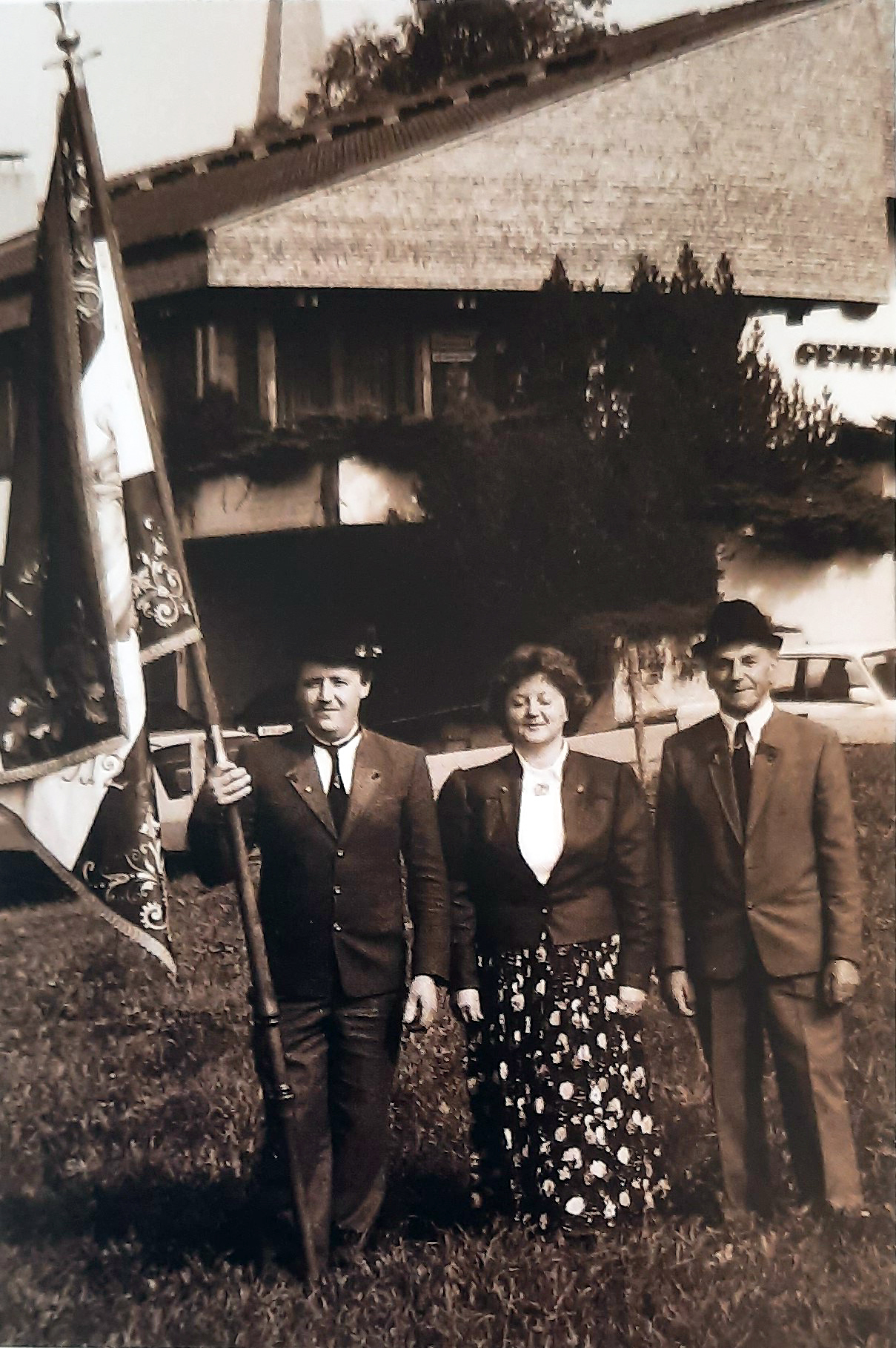 Zuletzt wurde das Schmuckstück 1990 – im Bild Christian Winder (vormaliger Fähnrich) mit der damaligen Fahnenpatin Rosmarie Flatz und dem ehemaligen Obmann Alfred Steurer († 2017) – erneuert. (Archiv, HeimatBuch)
