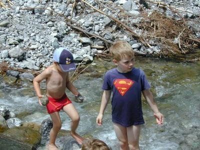 Justin und Elias erkunden den Bach..