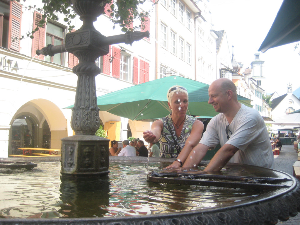 Kirsten und Stefan verschafften sich beim Brunnen eine kleine Abkühlung.