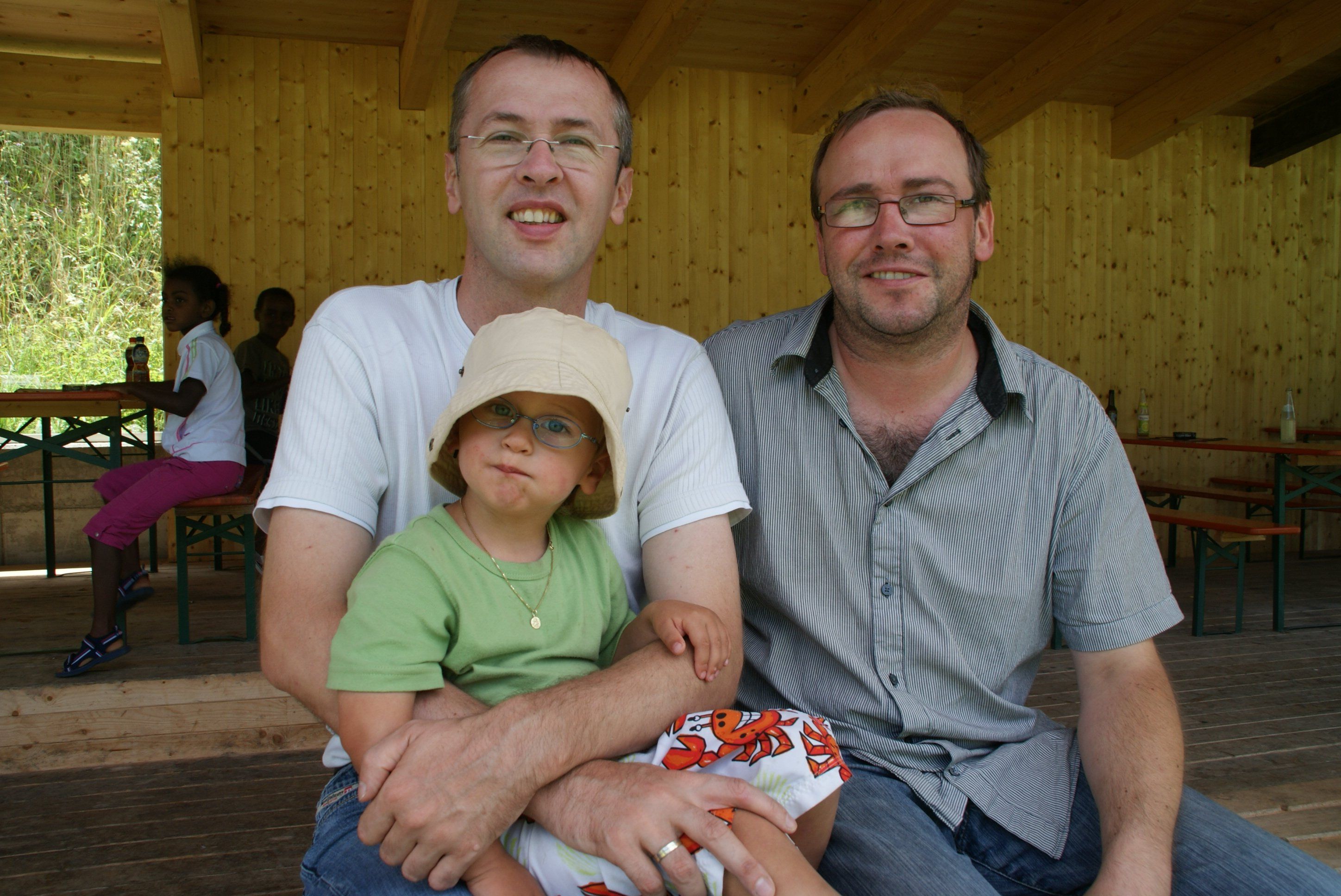 Mario, Alex und Aaron Hammerer auf der neuen Tribüne des FC Brauerei Egg