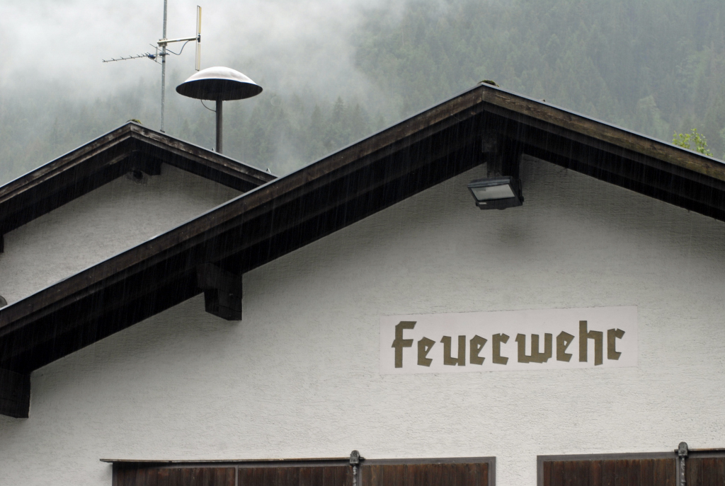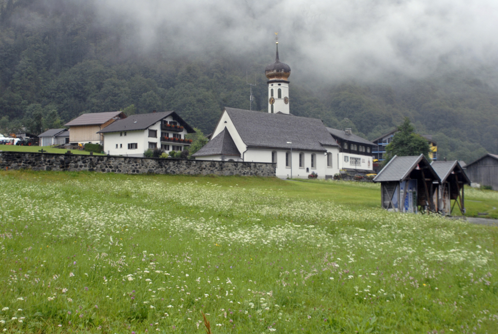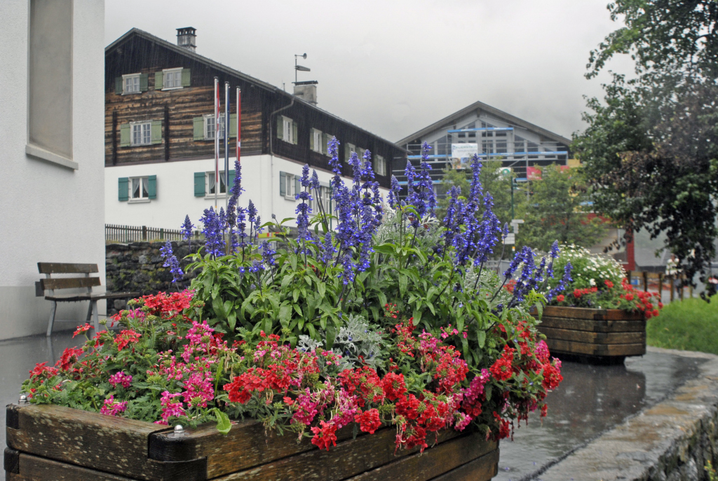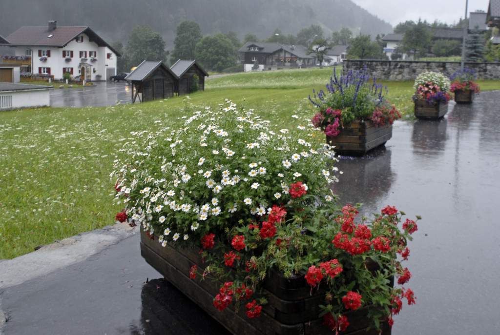Ortsteil Gortipohl in der politischen Gemeinde St. Gallenkirch: Feuerwehrgerätehaus, Transparent, Dorfkern Gortipohl, Gebirgsbach, Blumen am Schulplatz und Kirchplatz.