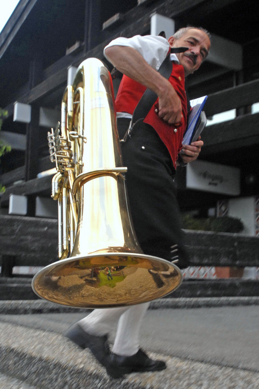 Gebhard Marent, Mitglied der Harmoniemusik Schruns, nach dem Platzkonzert auf dem Weg zum Probelokal. (Foto: Gerhard Scopoli, 25. Juni 2010)