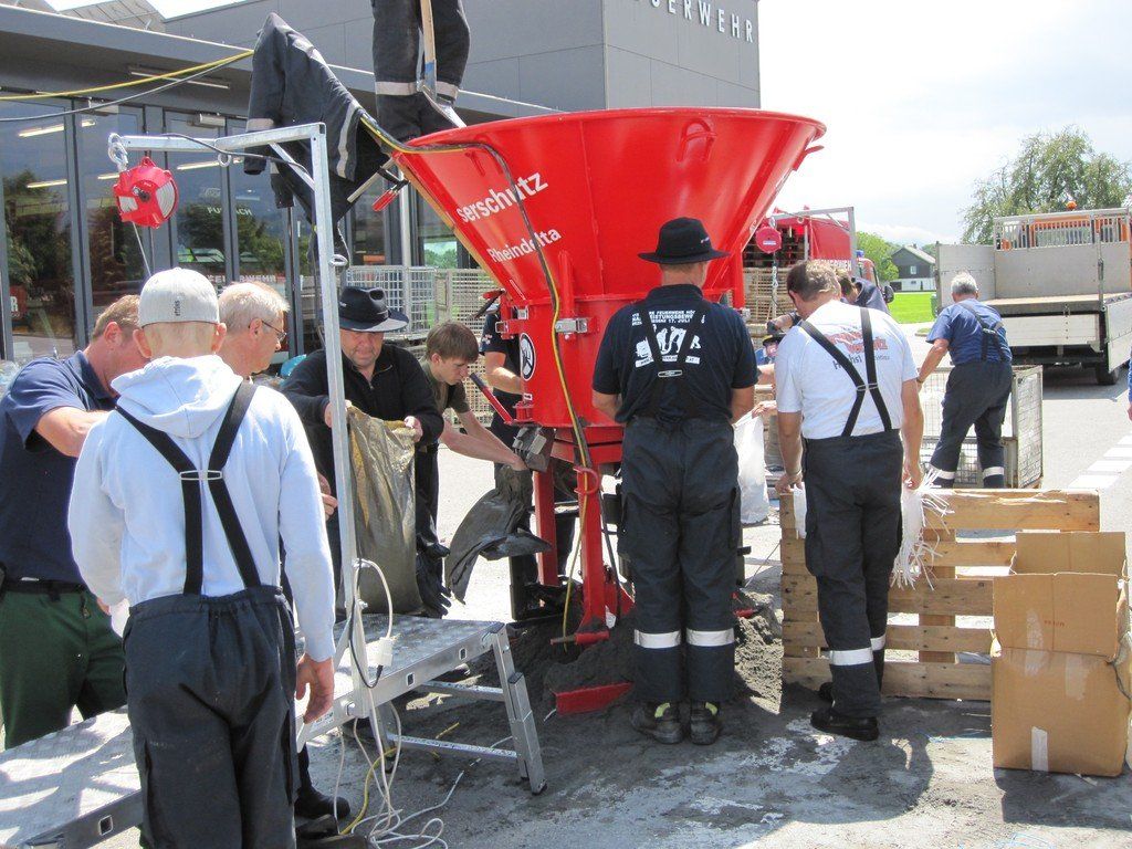 Überschwemmung in Vorarlberg: Rheindelta-Feuerwehren füllen Sandsäcke ab