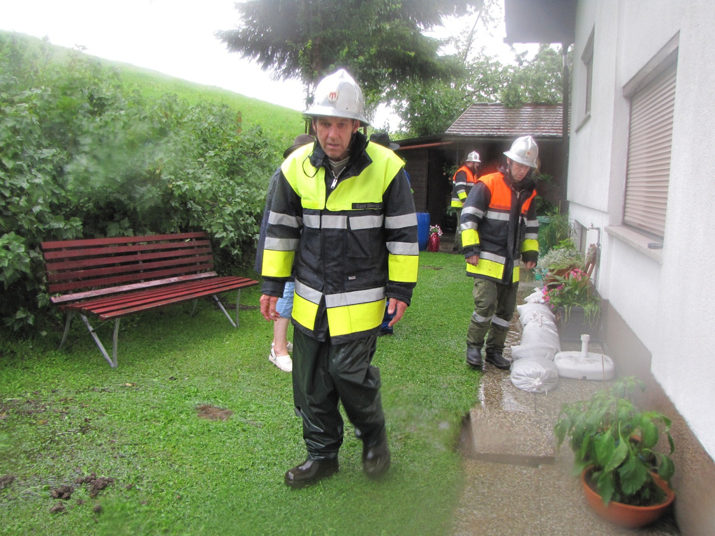 Sandsäcke sichern ein Wohnhaus im Heimen vor Wassereintritt