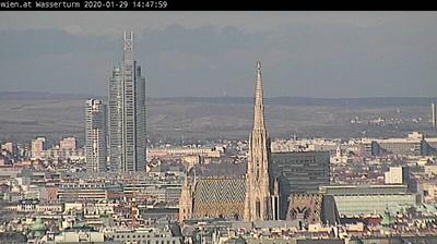 Blick vom Wasserturm in Richtung Milleniumstower und Stephansdom. Webcam auf ca. 380 Meter Seehöhe. (Quelle: www.wien.gv.at)