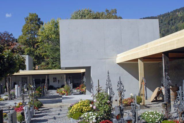 In Anlehnung an den Betonmonolyth der Aufbahrungshalle entstand ein reduziertes Gemeinschaftsgrab, das die Mensa und das Retabel der alten Friedhofskapelle sowie das Kruzifix aufnehmen wird. Alle diese Teile werden restauriert. (Foto: Gerhard)