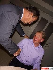 Dipl-VW und Bregenzer Ehrenbürger Siegi Gasser gratuliert Sportdirektor Jan Ove Flindt zu den Erfolgen in der letzten Zeit.