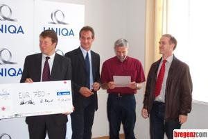 Landesdirektor der UNIQA Dr. Thomas Hackspiel überreichte mit Bgm. Markus Linhart der Hauptschule Bezau den 2. Preis des "Gut Drauf - Gesundheitspreises 2002".