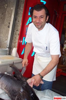 Als wahrer Geheimtipp für Fisch- und Pastaliebhaber entpuppte sich das italienische Restaurant La Palma im Bregenzer Hotel Kaiser am Samstag. Hausherr und Chefkoch "Giuseppe", wie er von allen liebevoll genannt wird, überraschte seine zahlreichen Gäste bei herrlichem Wetter mit einem 38 kg schweren Schwertfisch. Direkt aus Genua geliefert wurde der riesige Fisch vor den Augen der Gäste am Lavasteingrill zubereitet. Der Duft des Grillens verbreitete sich angenehm über die Innenstadt und ließ so manchem das Wasser im Mund zusammenlaufen.