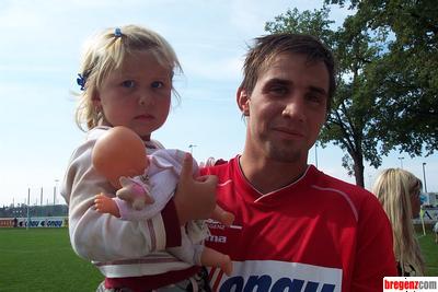 Die kleine Kim genoss gemeinsam mit ihrem Papa und Viktoria-Bregenz-Kicker Oliver Ofentausek den schönen Sonntagvormittag im Stadion vom FC Viktoria 62 Bregenz. Gegen die Fußballkollegen vom Verein Sparkasse Blau-Weiß Feldkirch holten sich die Bregenzer einen Punkt, beide Mannschaften trafen je einmal das Tor. Nach dem Spiel zapfte Bgm. DI Markus Linhart ein Mohrenbräu-Holzfässchen an. Das traditionelle Oktoberfest wurde somit auch im Bregenzer Viktoriastadion gefeiert.