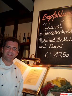 Martin Berthold vom Bregenzer Wirtshaus am See präsentiert derzeit seiner großen Gästeschar knusprige Gansln. Von seiner hervorragenden Kochkunst ließen sich am Donnerstagabend auch Werner Malang (VW Malang), Dr. Jodok Fink oder Stardesigner Mag. Dr. Andreas Aschauer-Martinelli überzeugen.