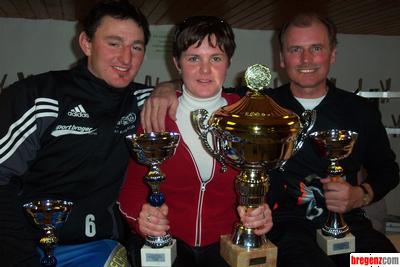 Am Samstag fand am Diedamskopf in Schoppernau das traditionelle Musikantenschirennen statt. Rund 250 Musikanten waren am Start und der Musikverein Mellau gewann heuer den heißbegehrten Wanderpokal der Mannschaftswertung. Bild: Die Bestzeithalter Wolfgang, Rebeca und Gerhard vom MV-Mellau.