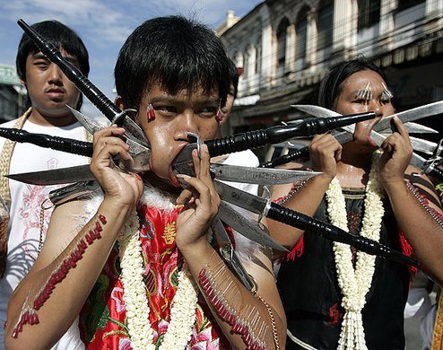 Piercings für Hartgesottene präsentieren diese Thailänder beim "Vegetarier Festival" in Phuket. © EPA