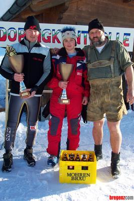 Bei bester Witterung konnte vergangenen Samstag der WSV-Sibratsgfäll den Krähenberg Super-G durchführen. 80 Starter kämpften um Bestzeiten. Ex-Schiclub Bregenzerwald Obmann Jösle Nußbaumer sorgte für eine interessante Moderation. Wieder mal für eine Einlage sorgte Otto-Karl Nußbaumer, er bewältigte den Lauf mit 30-jährigen Skiern und natürlich mit dazu passenden Lederhosen. Die Tagesbestzeiten sicherten sich bei den Damen Melitta Eberle (WSV-Sibratsgfäll) bzw. bei den Herren Claudio Dietrich (´s Bärle SV Mellau Racing Team), die auch die Dopingkontrolle von Otto-Karl bestens überstanden haben. Anschließend würde noch im Gasthaus Hirschen ausgibig gefeiert. Bild: Claudio, Melitta und Otto-Karl.