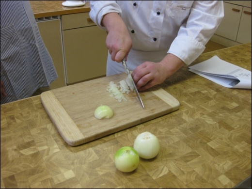 Der Kursleiter zeigt wie das Zwiebelschneiden die Profis machen