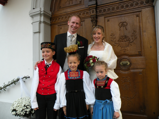 Kinder in der Wäldertracht mit dem Brautpaar.
