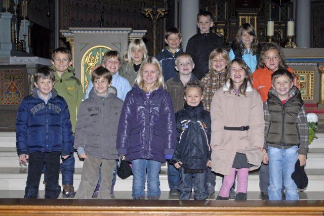 Die 15 Erstkommunikanten aus Schruns haben sich vor kurzem im Sonntagsgottesdienst der Gemeinde vorgestellt. Am zweiten Ostersonntag, dem 11. April 2010 werden sie erstmals das Sakrament der Eucharistie empfangen. (Foto: Gerhard Scopoli)