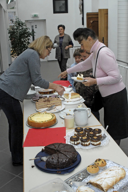 Nach dem Vorstellungsgottesdienst trafen sich die Gemeindemitglieder zum Pfarrkaffee im Pfarrheim St. Jodok, einem beliebten Treffpunkt. Weitere Termine: 15., 22. und 29. November 2009. (Foto: Gerhard Scopoli)