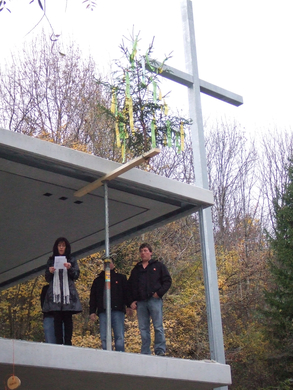 Obfrau Carmen Nachbaur beim Vortragen des Firstspruchs mit der Mannschaft von Wilhelm+Mayer Bau GmbH, die den Firstbaum aufrichteten.