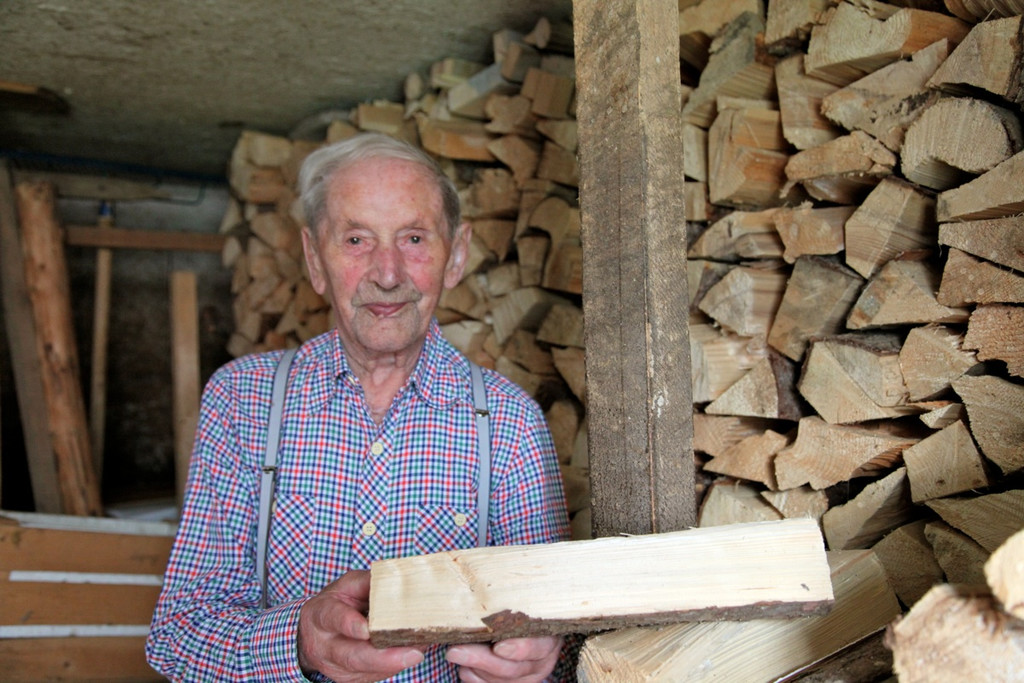 Albert Kaufmann macht auch Hausarbeiten , stellt Buscheln her und ist froh, dass er einen Spalter hat, damit er nicht mehr das Brennholz "schitta" muss.