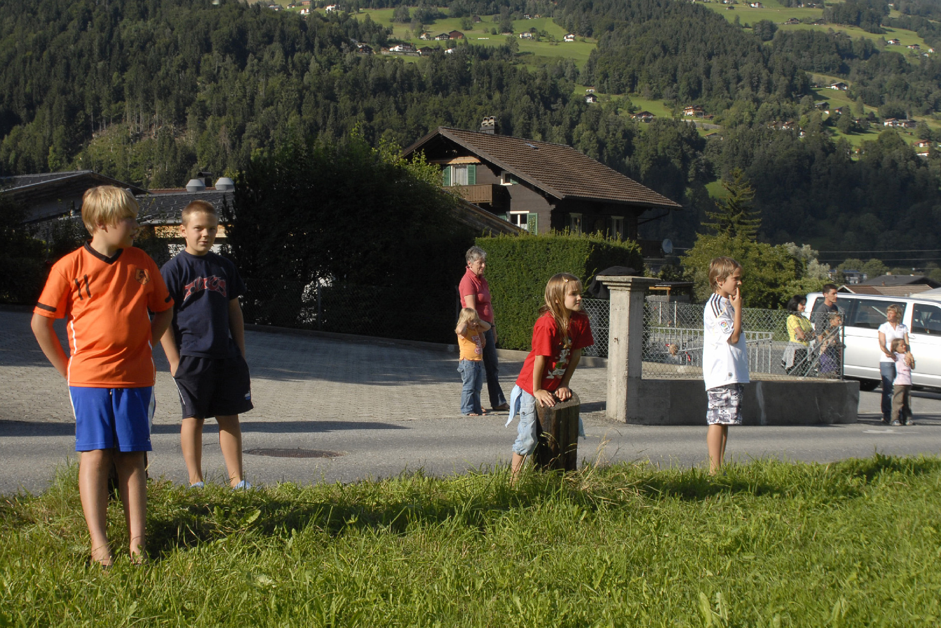 Kinder beobachten den Abflug des Polizeihubschraubers in Tschagguns. (Foto: Gerhard Scopoli, 3. Sep. 2010)