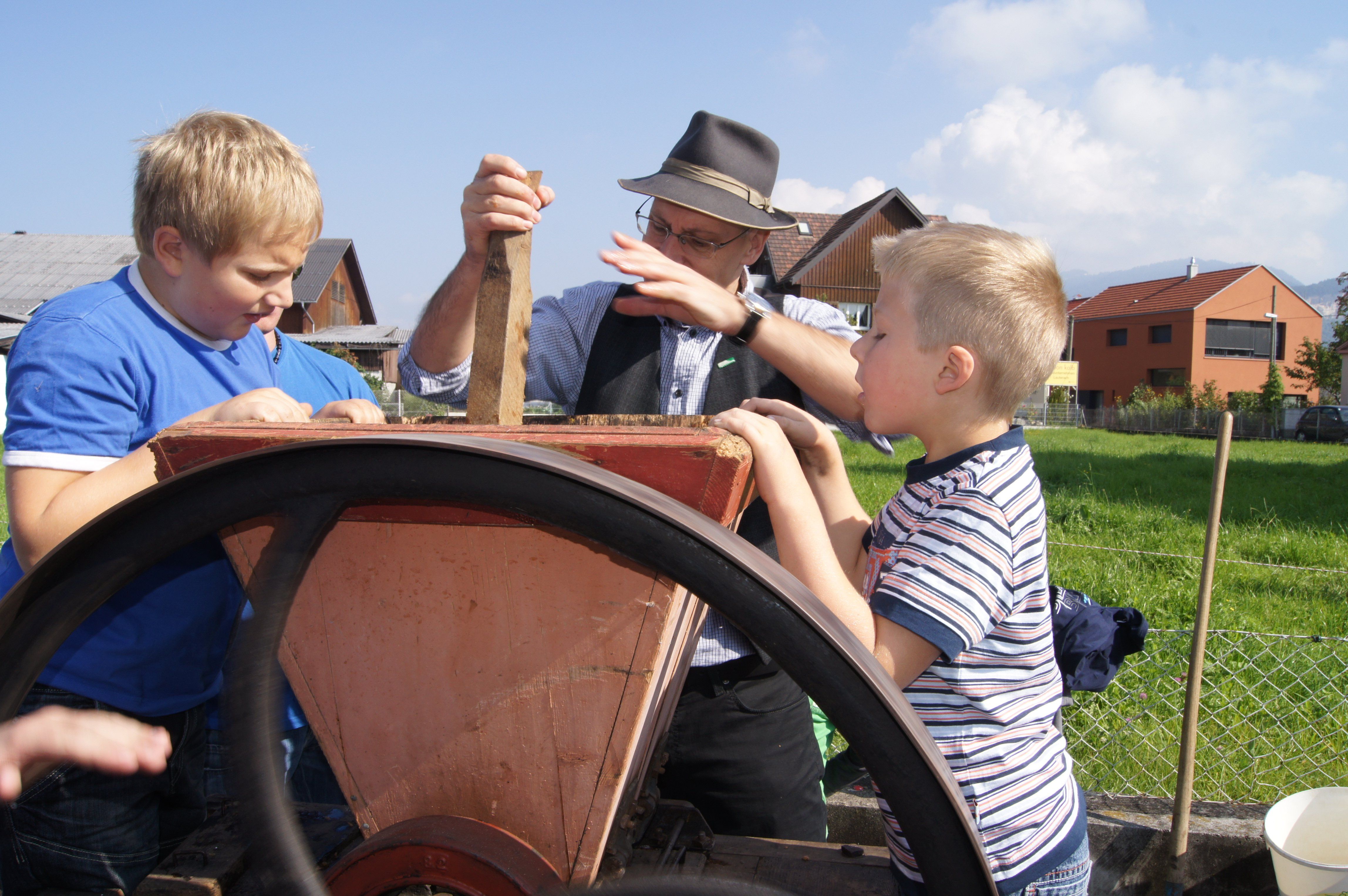 Kinder an der alten Mostpresse