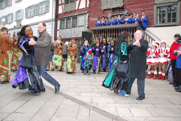 Bürgermeister Rümmele und Vizebürgermeister Ruepp mit ungewöhnlichen Tanzpartnerinnen.