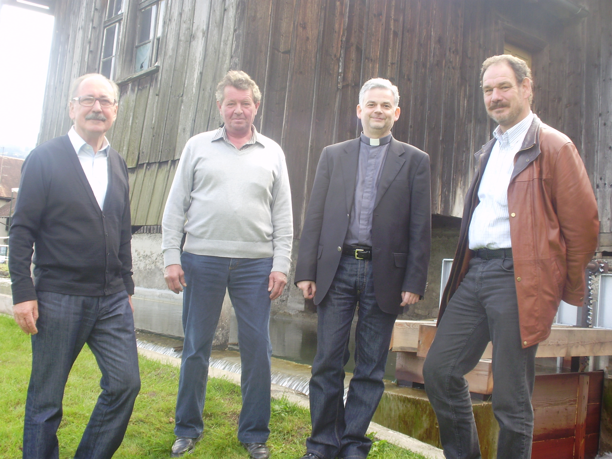 Werner Abbrederis (Besitzer Öko-Stromanlage), Johann Karl Frick (Besitzer Sägewerksgebäude), Pfarrer Walter Juen und Norbert Zündt (Obmann Mühlbachgenossenschaft).