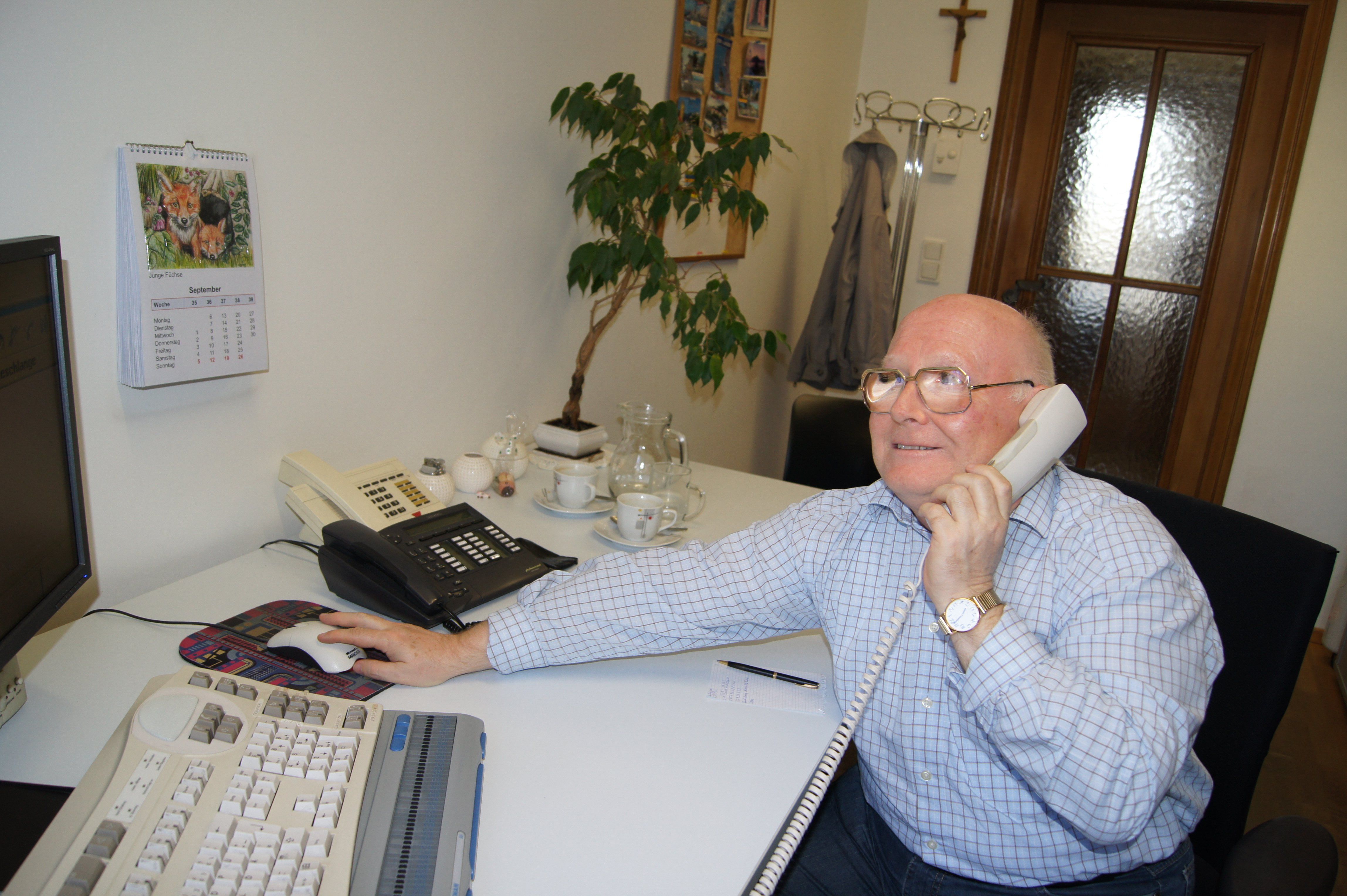 Seit 40 Jahren leitet Manfred Schuler die Anrufe in der Telefonzentrale im Rathaus Dornbirn weiter.