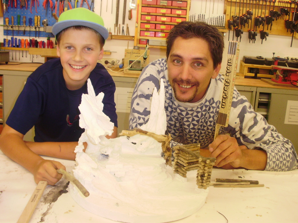 Basteln gemeinsam eine Krippe im Kurs: Papa Marcel mit Benjamin.