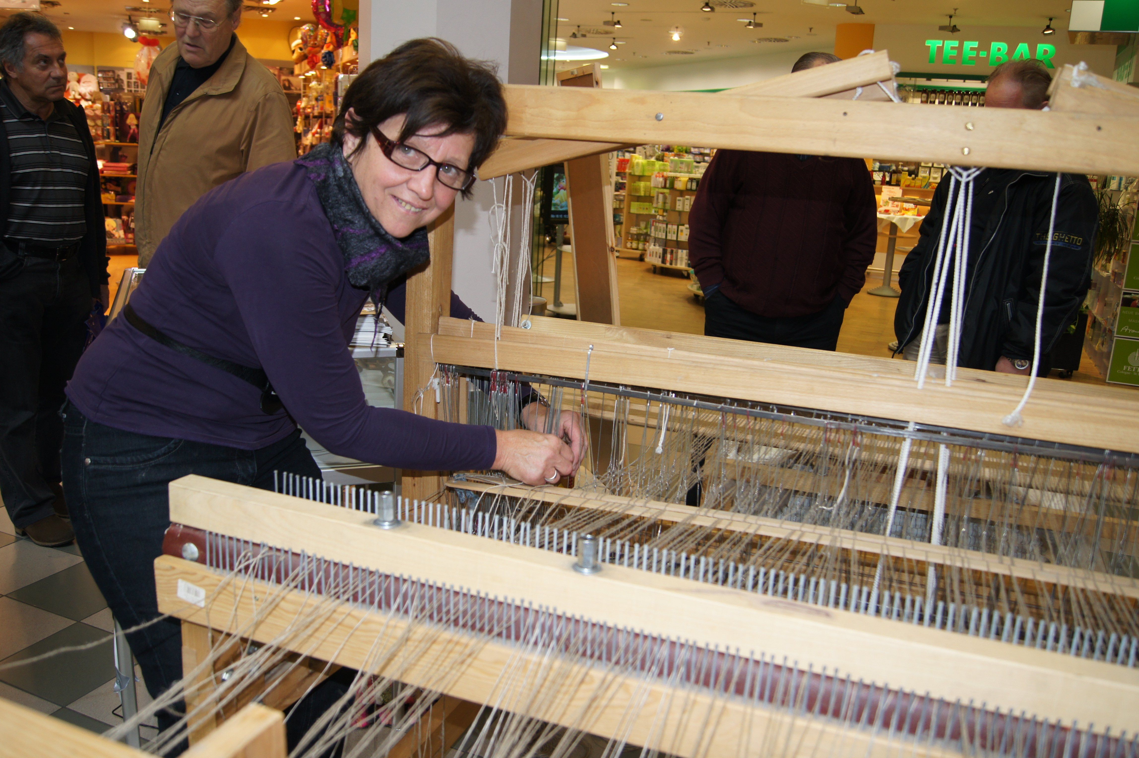 Martha Niederacher an einem Webstuhl aus früheren Tagen.