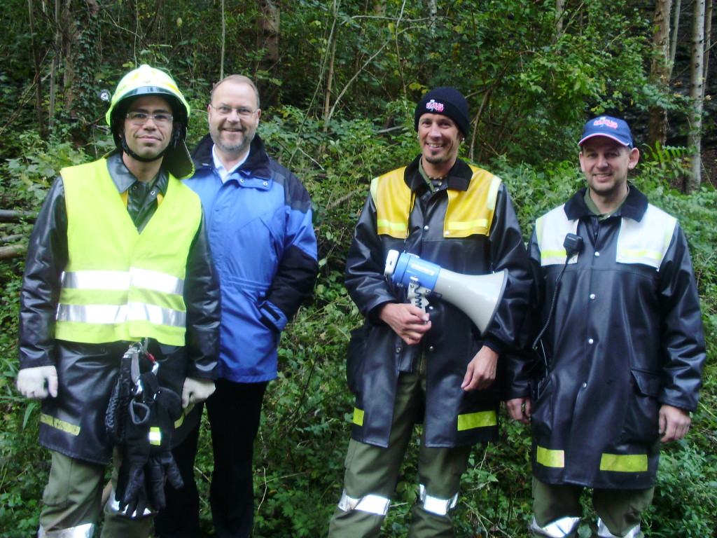 Einsatzleiter Michael Moosbrugger, Bgm. Werner Müller, Vize-Kommandant Markus Bitsche und Übungsvorbereiter Benjamin Dobler.