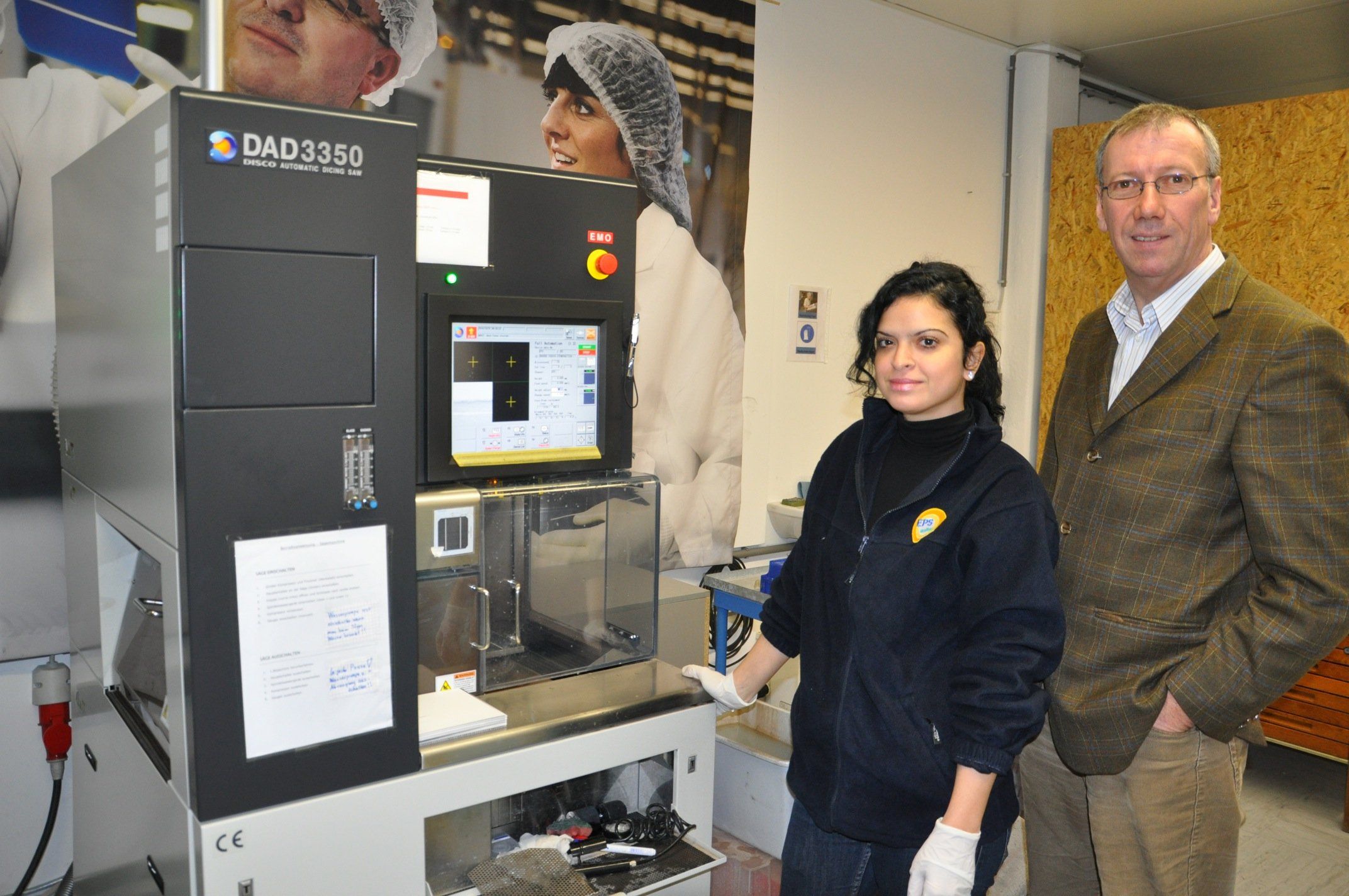 Guelcan Sahin und Richard Hutter vor der Solarzellen-Zuschneidemaschine.