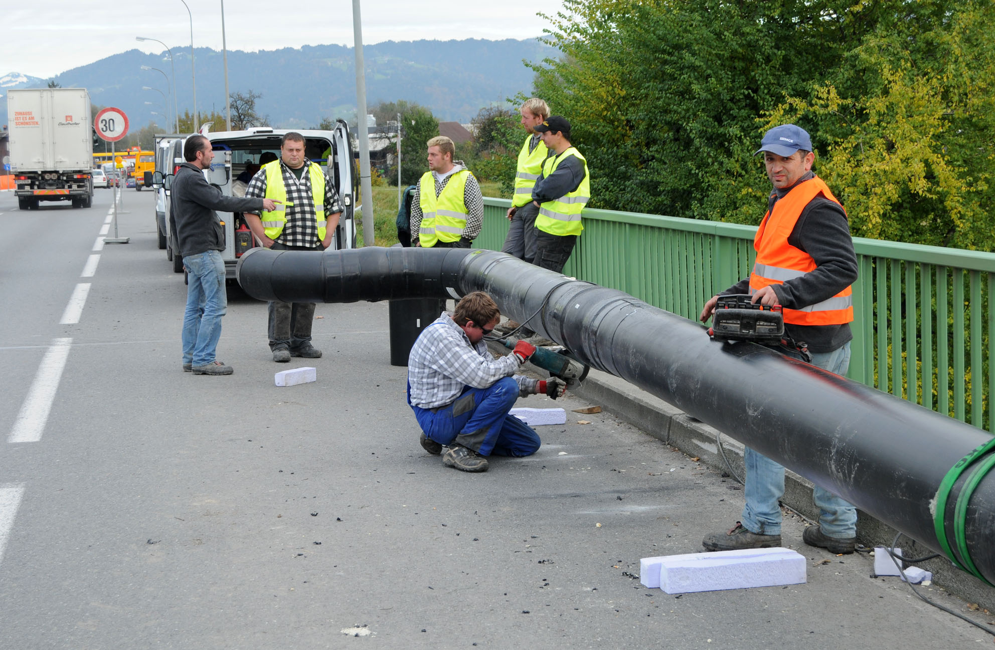 Befestigung der Nahwärmeleitungen an den Brücken über den Kobler und die Dornbirnerache