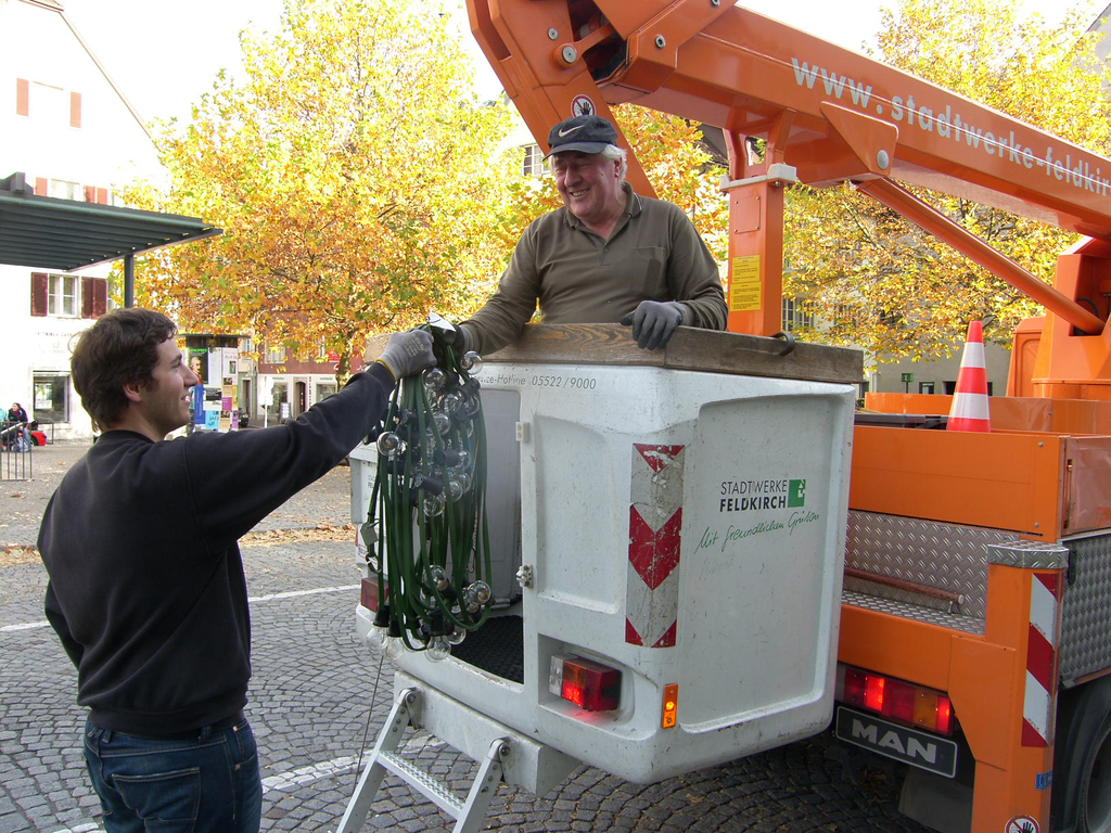 Anton Zimmermann und Mitarbeiter Tobias installieren heute mit moderner Technik die Weihnachtsbeleuchtung.