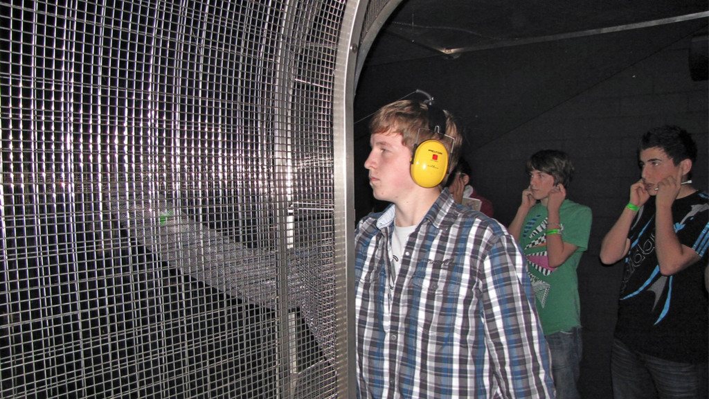 Geschützt durch einen Faraday’schen Gang versucht manch Mutiger die Blitze mit Spezialhandschuhen einzufangen