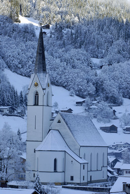 Die neugotische Pfarrkirche zu den heiligen Josef und Nikolaus in Silbertal wurde nach dem Plan des Kölner und Wiener Dombaumeisters Friedrich von Schmidt erbaut. (Foto: Gerhard Scopoli, 17. November 2010)