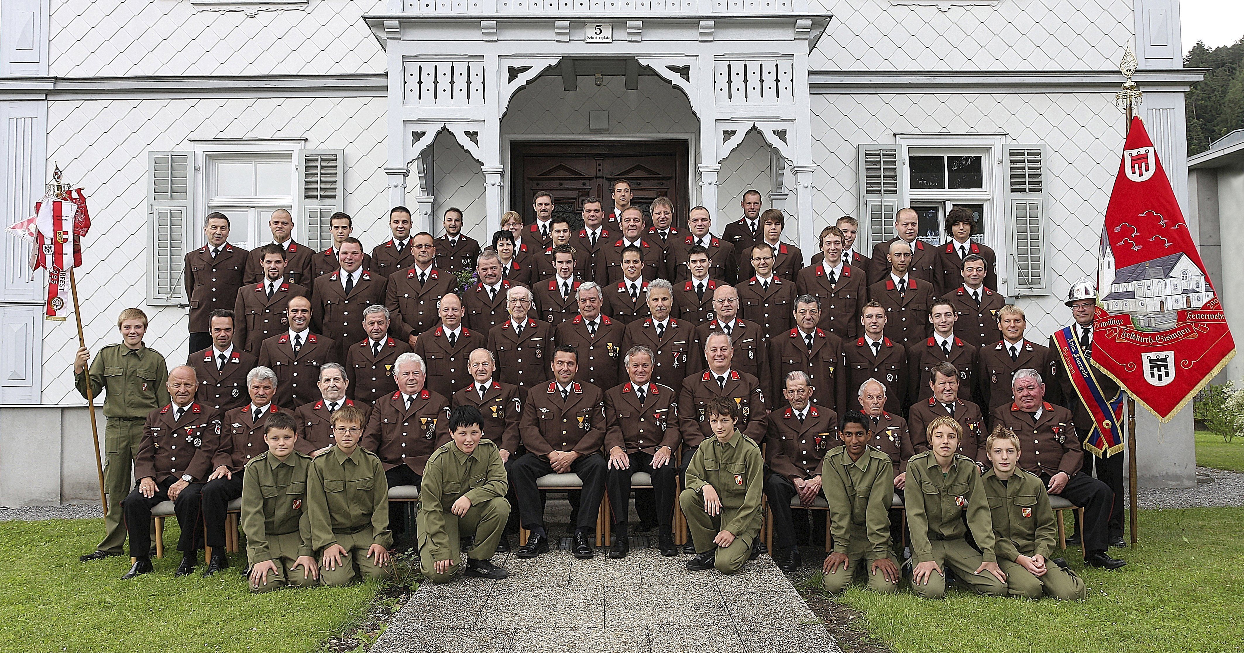 Mannschaftsbild der FW Gisingen vor dem neu renovierten Pfarrhaus in Gisingen (zehn Mann fehlen).