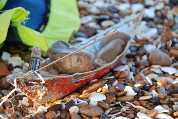 Ein selbstgemachtes Spielboot der Kinder am Strand.