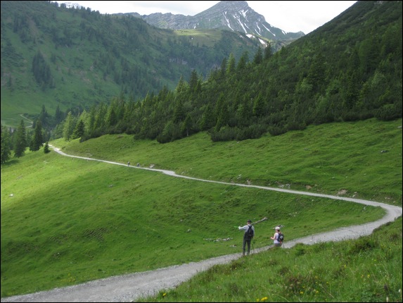 durch sattes Grün geht es leicht abwärts zur Parpfienzsalpe