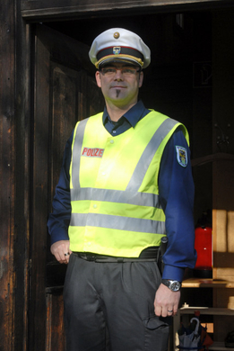 Der Gemeindepolizist von Schruns, Herbert Schuster, zeigte den Kleinen, wie sie sich im Straßenverkehr verhalten müssen. (Foto: Gerhard)
