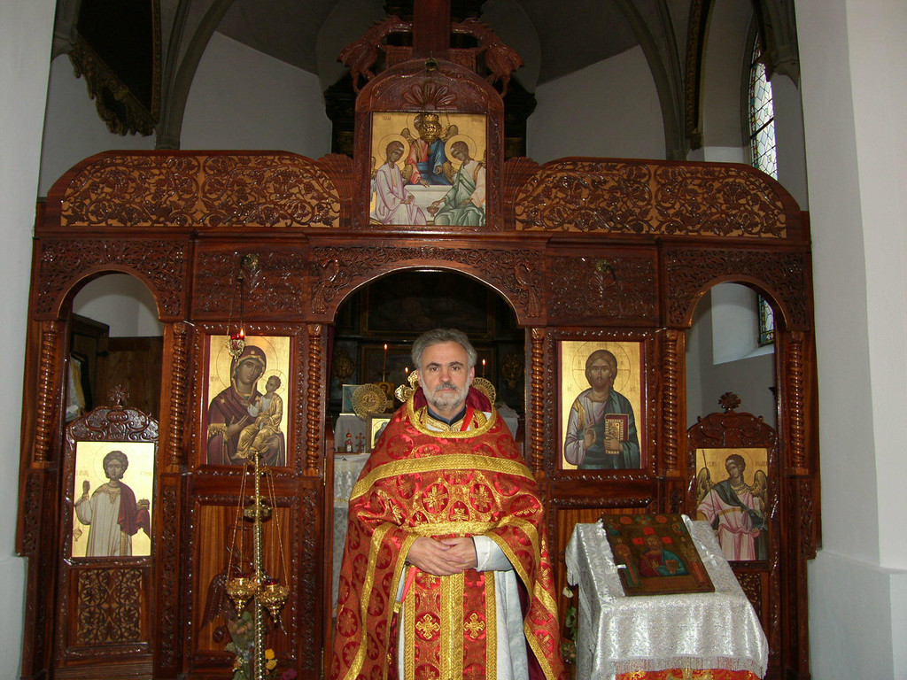 Erzpriester Mile Mijič vor der Ikonstase (Ikonenwand)