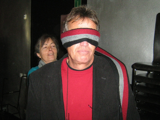 Lehrer Edi Meusburger stellt sich als Vorzeigebeispiel beim Theaterspiel zur Verfügung